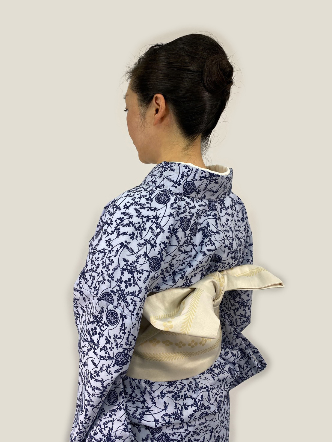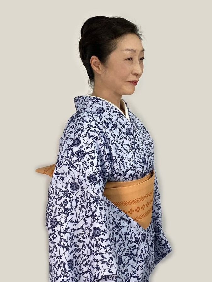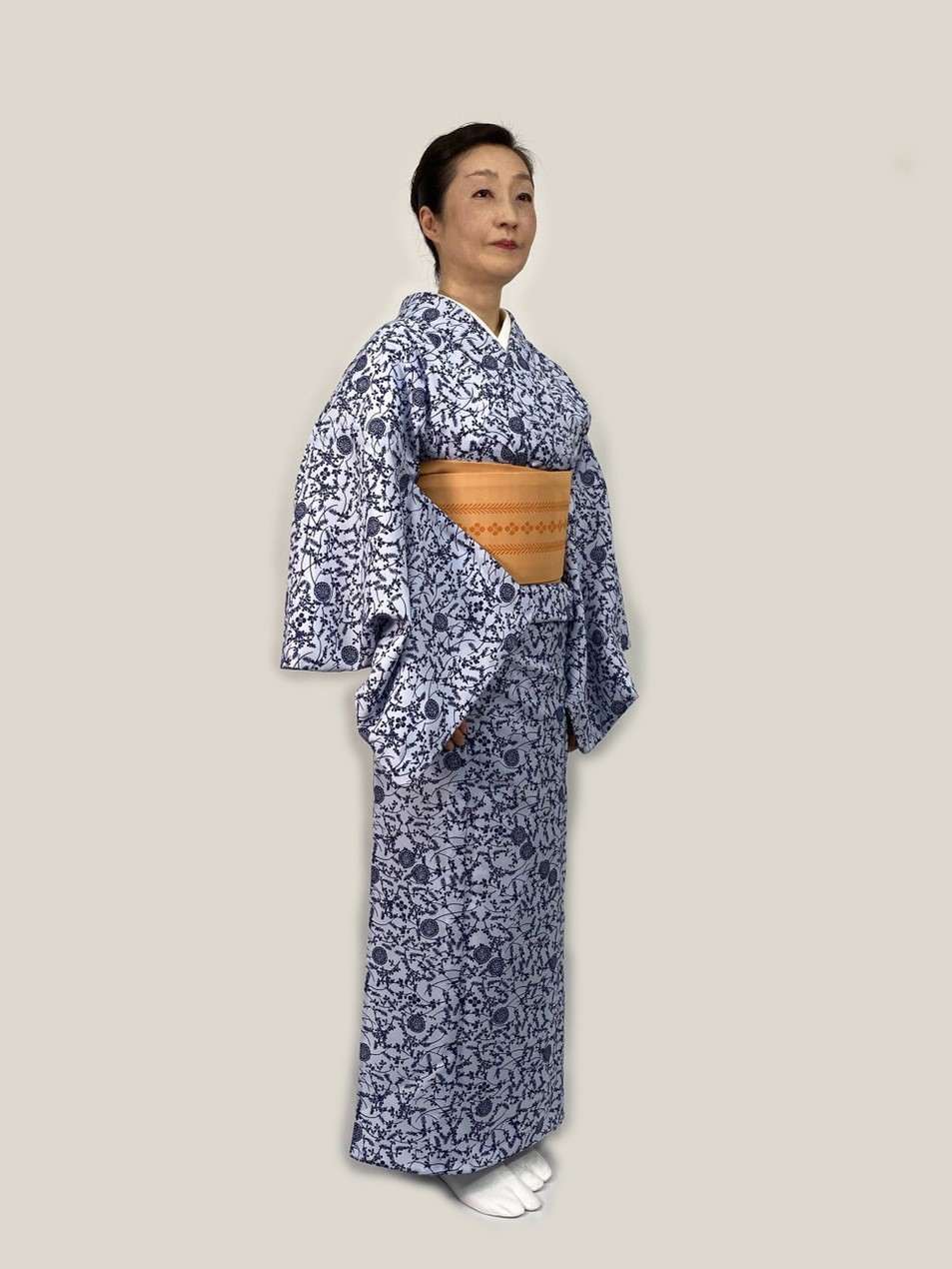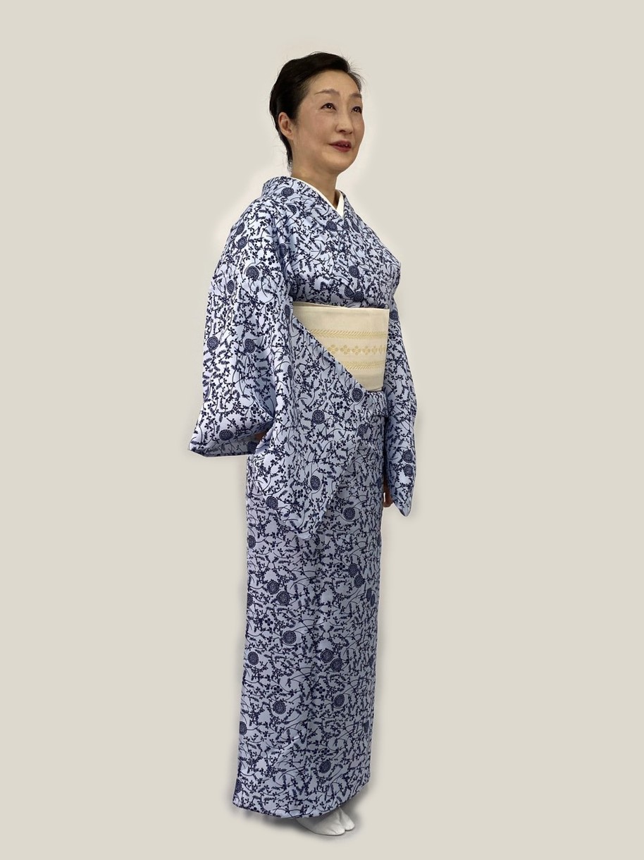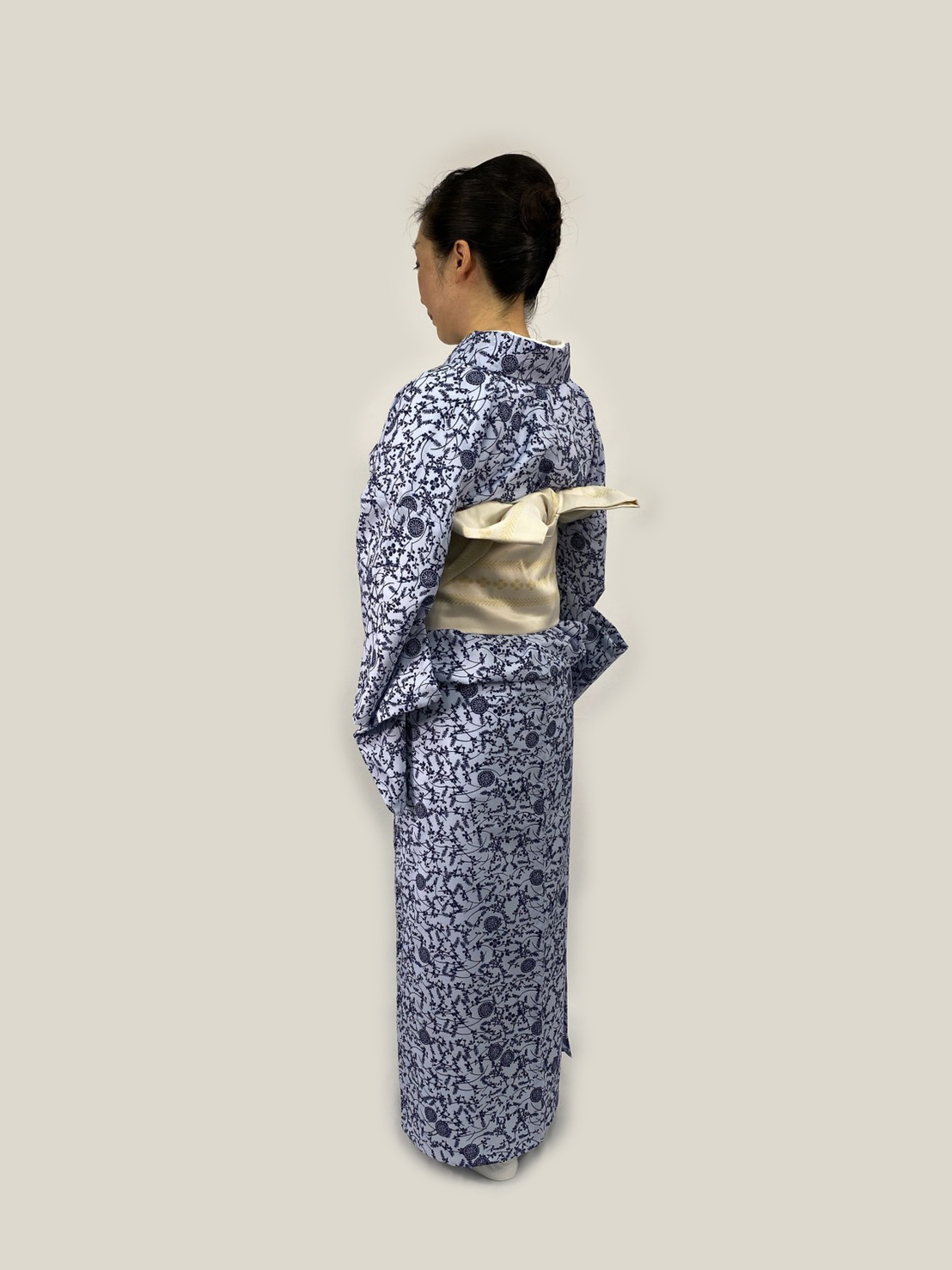 3号柄(水色地に紺) 萩にかつみ文様 ポリエステル100%・セオα 税込み販売価格 20,400円 4号柄 帯 大和柿 税込み販売価格 11,100円 5号柄 帯 象牙 税込み販売価格 11,100円